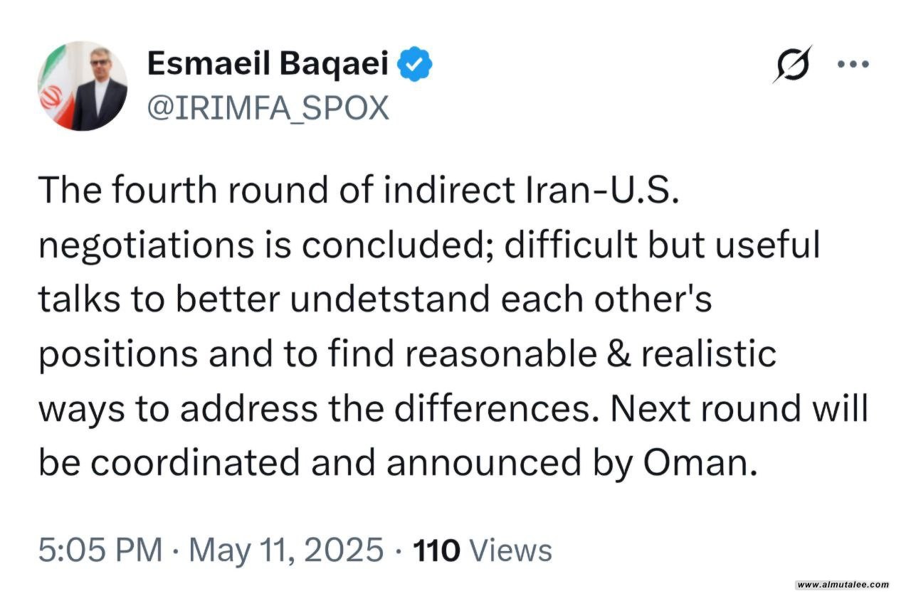 اعلن المتحدث باسم وزارة الخارجية الإيرانية، إسماعيل بقائي، اليوم الأحد، عن:"اختتام الجولة الرابعة من المفاوضات غير المباشرة بين إيران والولايات المتحدة، والتي جرت في العاصمة العُمانية مسقط".