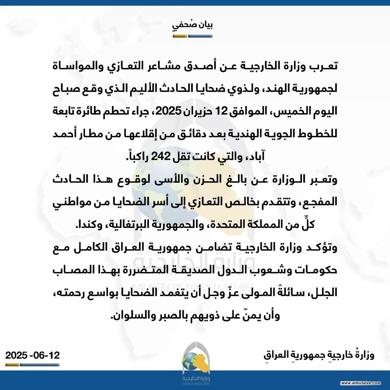 اعربت وزارة خارجية جمهورية العراق، اليوم الخميس، عن تعازيها لدولة الهند، بسبب حادث تحطم الطائرة الهندية، في مطار أحمد آباد الدولي، معلنة عن تضامنها الكامل مع كل المتضررين من الحادثة.