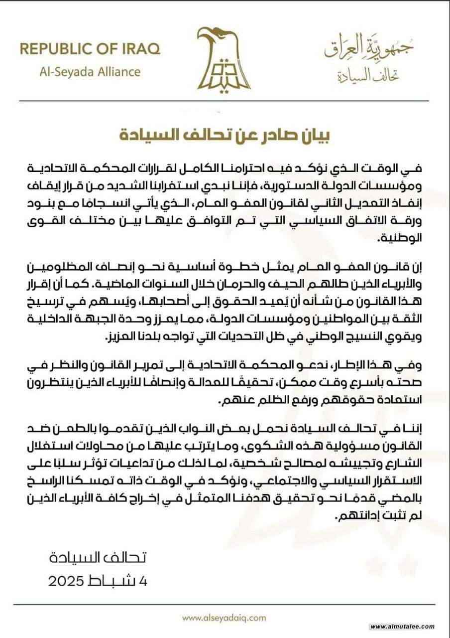 وقال التحالف في بيان تلقته المطلع، إنه:"في الوقت الذي نؤكد فيه احترامنا الكامل لقرارات المحكمة الاتحادية ومؤسسات الدولة الدستورية، فإننا نبدي استغرابنا الشديد من قرار إيقاف إنفاذ التعديل الثاني لقانون العفو العام، الذي يأتي انسجاماً مع بنود ورقة الاتفاق السياسي التي تم التوافق عليها بين مختلف القوى الوطنية".