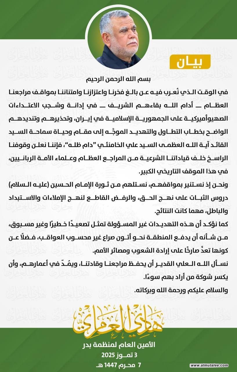 هادی عامری ئەمینداری گشتیی ڕێکخراوی بەدر ئەمڕۆ پێنجشەممە، پشتیوانی تەواوی خۆی لە هەڵوێستەکانی مەرجەعە باڵاکانی ئایینی ڕاگەیاند کە هێرشەکانی زایۆنیستی-ئەمریکییان بۆ سەر ئێران شەرمەزار کرد ونیگەرانی خۆیان لەوتاری هەڕەشەئامێز کە ئاراستەی عەلی خامنەیی ڕێبەری مەزنی شۆڕشی ئیسلامیی ئێرانیان دەربڕی.