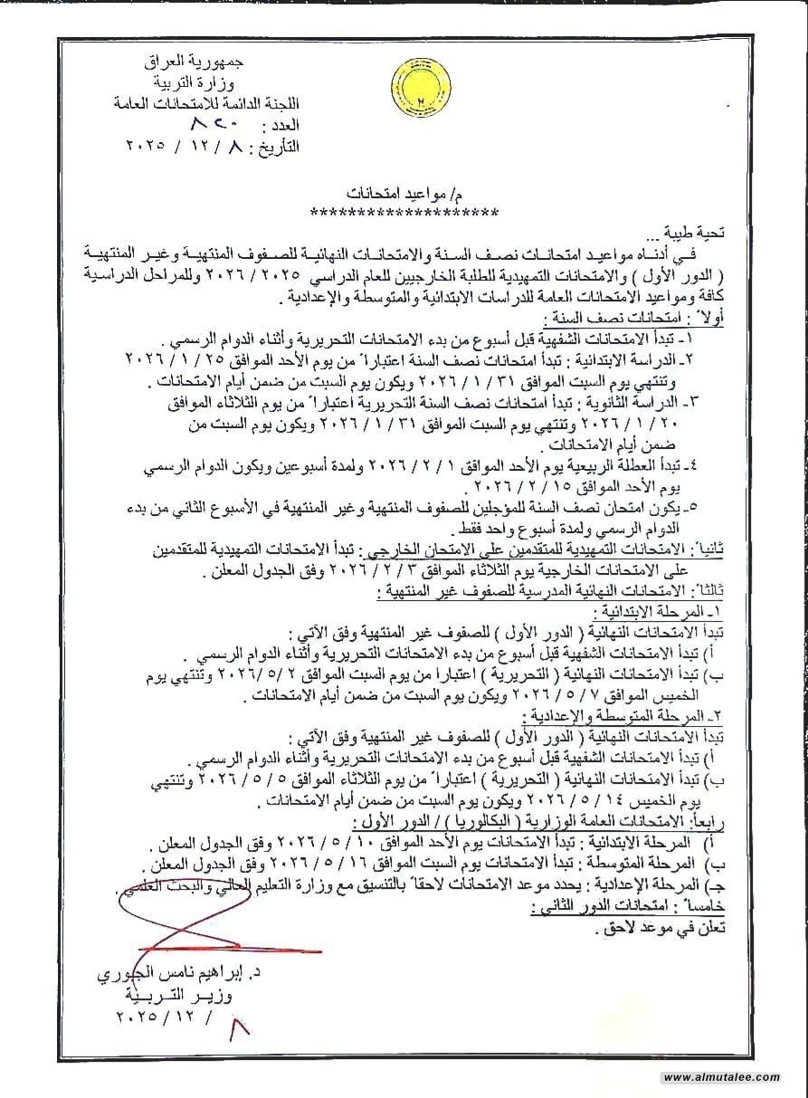 وەزارەتی پەروەردە خشتەی وادەی تاقیکردنەوەکانی نیوەی ساڵ و کۆتایی ساڵی بۆ قۆناغە کۆتاییەکان و ناکۆتاییەکان (خولی یەکەم) و تاقیکردنەوە بەراییەکانی قوتابیانی دەرەکی بۆ ساڵی خوێندنی 2025/2026 بەم شێوەیەی خوارەوە دیاری کردووە: