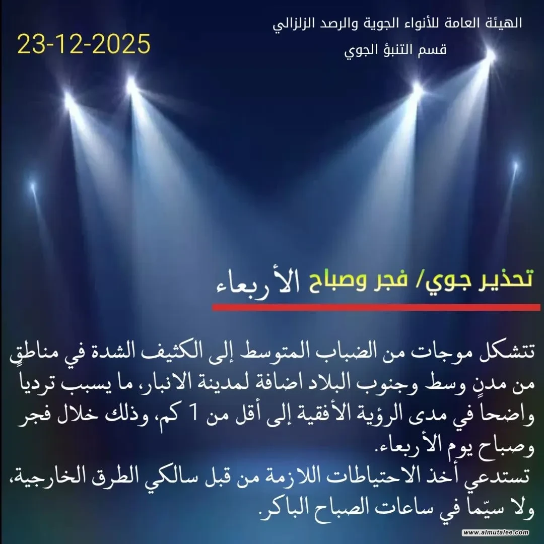 حذرت هيئة الأنواء الجوية، مساء اليوم الثلاثاء، من تشكل ضباب كثيف وانعدام الرؤية الأفقية في مدن وسط وجنوب العراق صباح الغد.