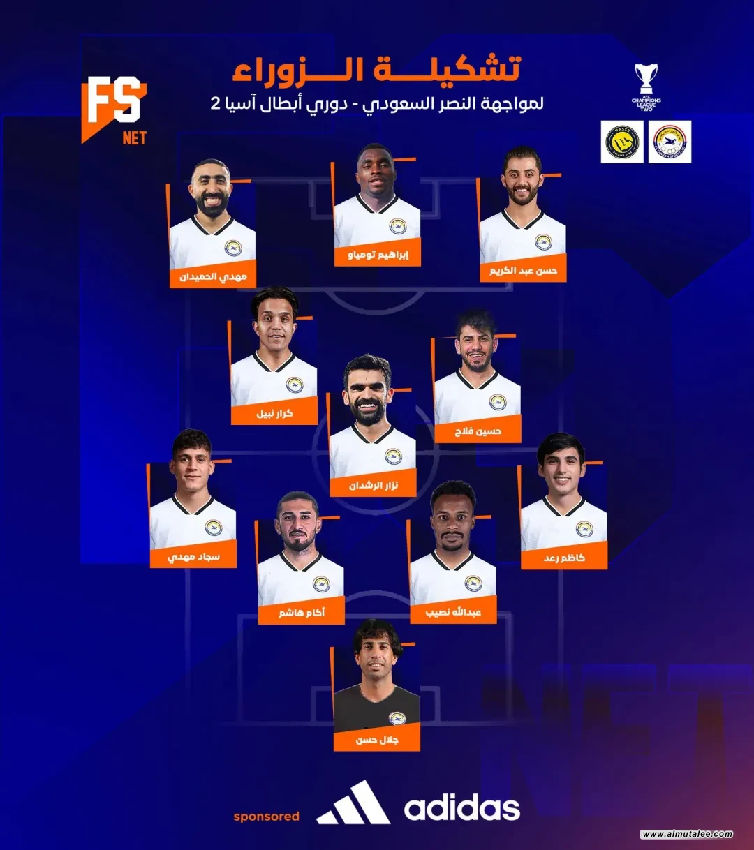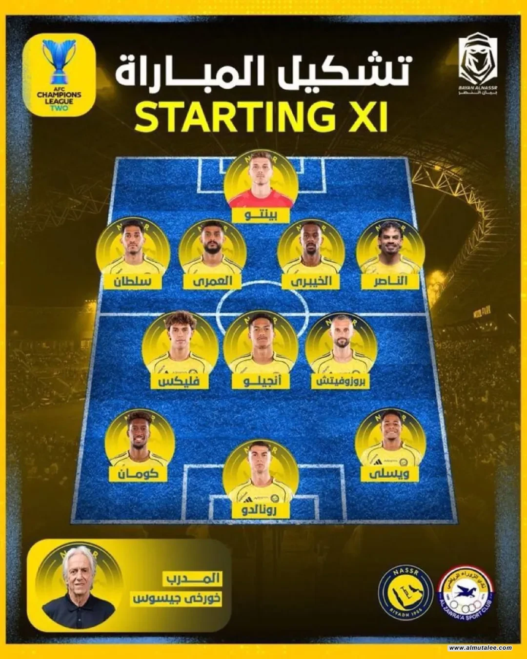 في المقابل، أعلن مدرب النصر السعودي، خورخي جيسوس، أن النجم العالمي كريستيانو رونالدو سيقود فريقه في مواجهة الزوراء، حيث أُدرج رسمياً ضمن تشكيلة النصر بعد أن كانت تحوم شكوك حول مشاركته في لقاء اليوم.