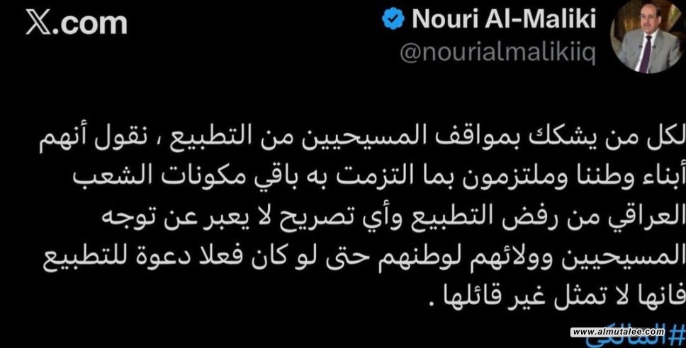 أعرب رئيس ائتلاف دولة القانون، نوري المالكي، اليوم السبت، عن استنكاره لمحاولات التشكيك بمواقف المواطنين المسيحيين، مؤكداً أن أي طرح يُفهم على أنه دعوة للتطبيع إن صحّ فهو يعبّر عن صاحبه فقط، ولا يمثل باقي مكونات الشعب العراقي ولا يعكس توجهاته العامة.