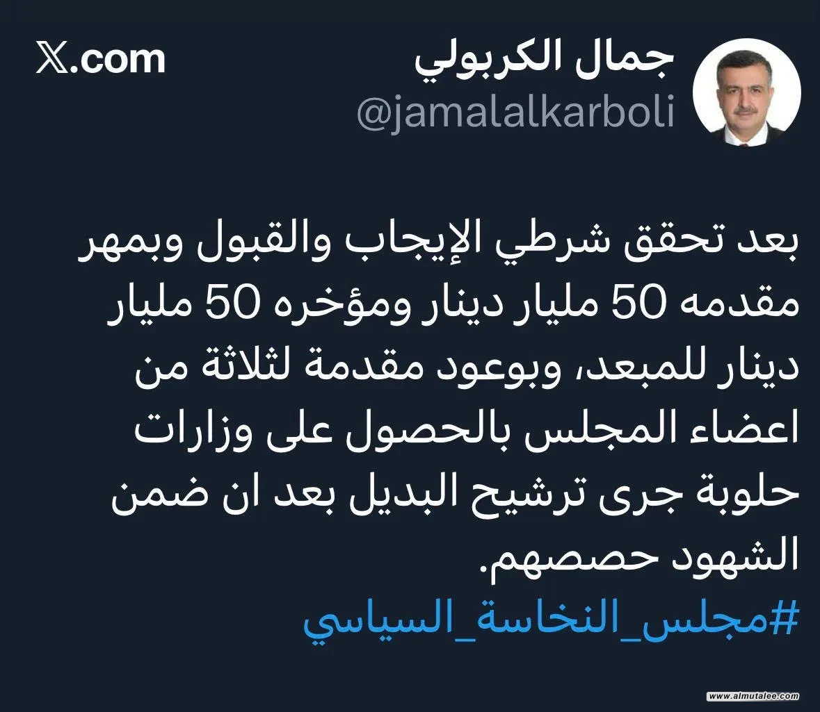 وقال الكربولي، عبر منصة (إكس): "بعد تحقق شرطي الإيجاب والقبول، وبمهر مقدمه 50 مليار دينار ومؤخره 50 مليار دينار للمبعد، وبوعود مقدمة لثلاثة من أعضاء المجلس على وزارات حلوبة، جرى ترشيح البديل بعد ان ضمن الشهود حصصهم".