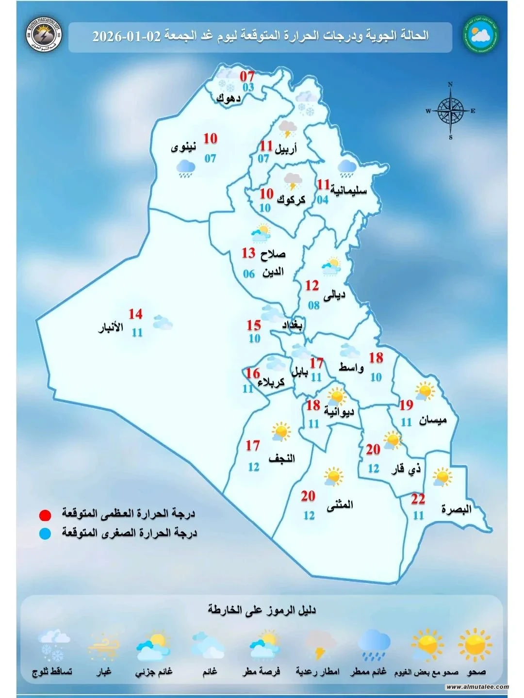 أعلنت هيئة الأنواء الجوية، اليوم الخميس، طقس العراق خلال الأيام المقبلة، مشيرة أنه سيكون غائم جزئياً بمحافظات الوسط والجنوب، مع فرص قوية لهطول الأمطار شمال البلاد.