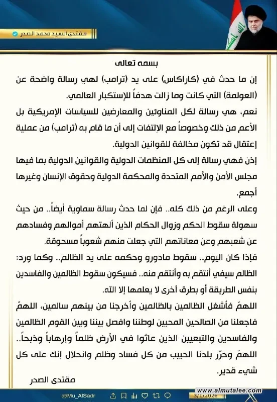 رێبەری رەوتی نیشتمانی شیعە لە پەیامەکەیدا دەڵێت، "ئەوەی لە کاراکاس لەسەر دەستی ترەمپ روویدا، پەیامێکی روونە سەبارەت بە بەجیهانیبوون کە ئامانجی ستەمکارانی جیهان بووە و هەرواش دەمێنێتەوە."