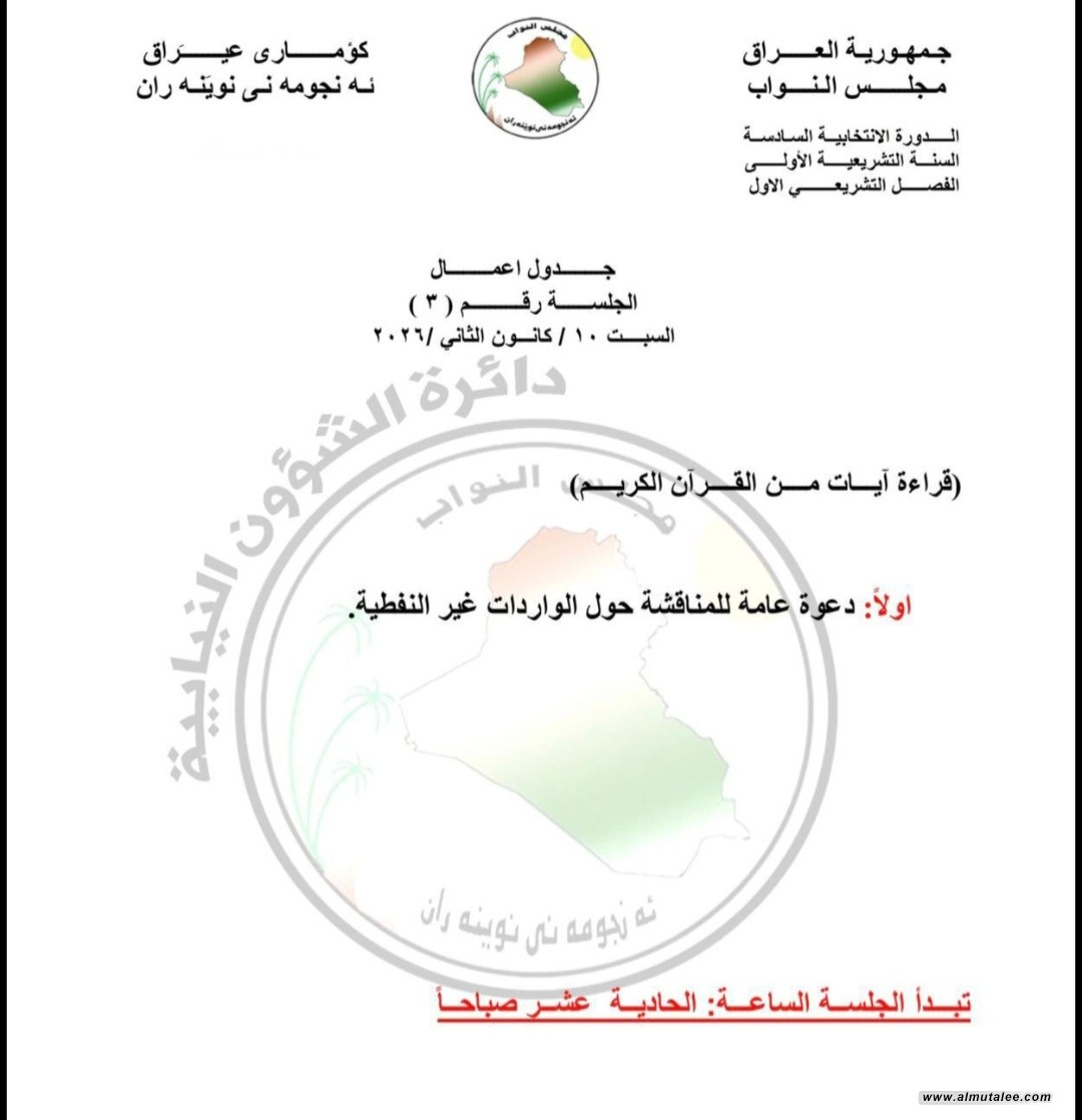 وذكرت الدائرة الإعلامية لمجلس النواب في بيان تلقته "المطلع"، أن "جدول أعمال جلسة يوم السبت المقبل يتضمن دعوة عامة للمناقشة حول الواردات غير النفطية".