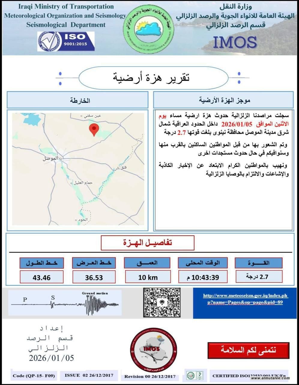 هزة أرضية بقوة "2.7" درجة شرق الموصل