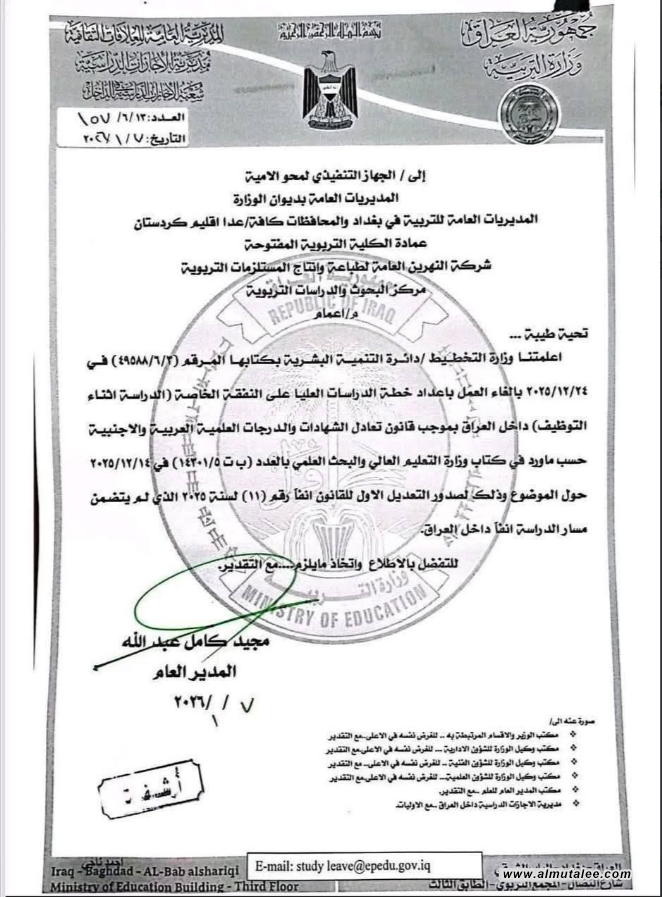 وذكرت التربية في إعمام وجهته إلى المديريات العامة كافة تابعته المطلع، أن:"وزارة التخطيط/ دائرة التنمية البشرية أعلمت الوزارة بإلغاء العمل بإعداد خطة الدراسات العليا على النفقة الخاصة (الدراسة أثناء التوظيف) داخل العراق بموجب قانون تعادل الشهادات والدرجات العلمية العربية والأجنبية".