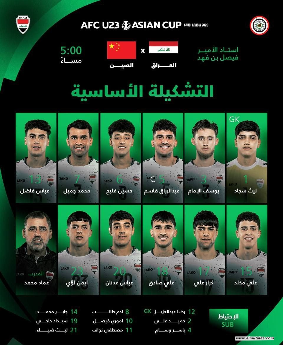 أعلن مدرب المنتخب الأولمبي العراقي عماد محمد، اليوم الخميس، عن تشكيلة المنتخب العراقي تحت 23 سنة لمواجهة منتخب الصين، مساء اليوم الخميس، ضمن منافسات كأس آسيا الجارية حاليا في السعودية.