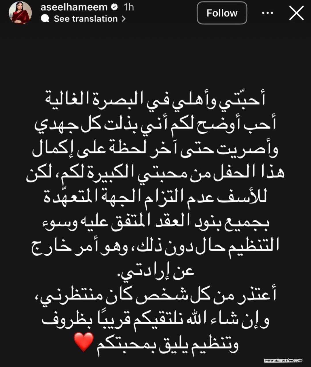 وقالت هميم في تدوينة على صفحتها الشخصية على "أنستغرام" وتابعتها "المطلع"،أن "أحبتي وأهلي في البصرة الغالية، أحب أوضح لكم أني بذلت كل جهدي حتى آخر لحظة على إكمال هذا الحفل من محبتي الكبيرة لكم، لكن للأسف عدم التزام الجهة المتعهدة بجميع بنود العقد المتفق عليه، وسوء التنظيم، حال دون ذلك وهو أمر خارج عن إرادتي".