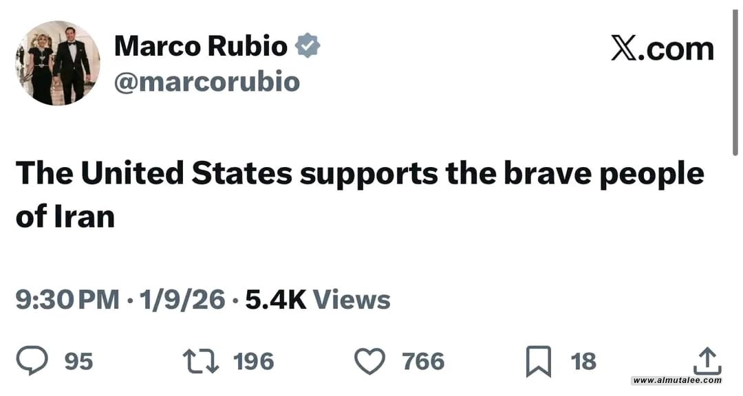 أكد وزير الخارجية الأمريكي، ماركو روبيو، صباح اليوم السبت، دعم الولايات المتحدة للشعب الإيراني، وذلك في تغريدة نشرها على منصة "أكس" للتعبير عن موقف واشنطن تجاه الاحتجاجات الجارية في إيران.