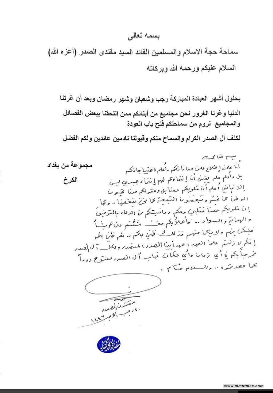 وأدناه نص الرسالة والرد من المكتب الخاص للصدر وتلقتها "المطلع":