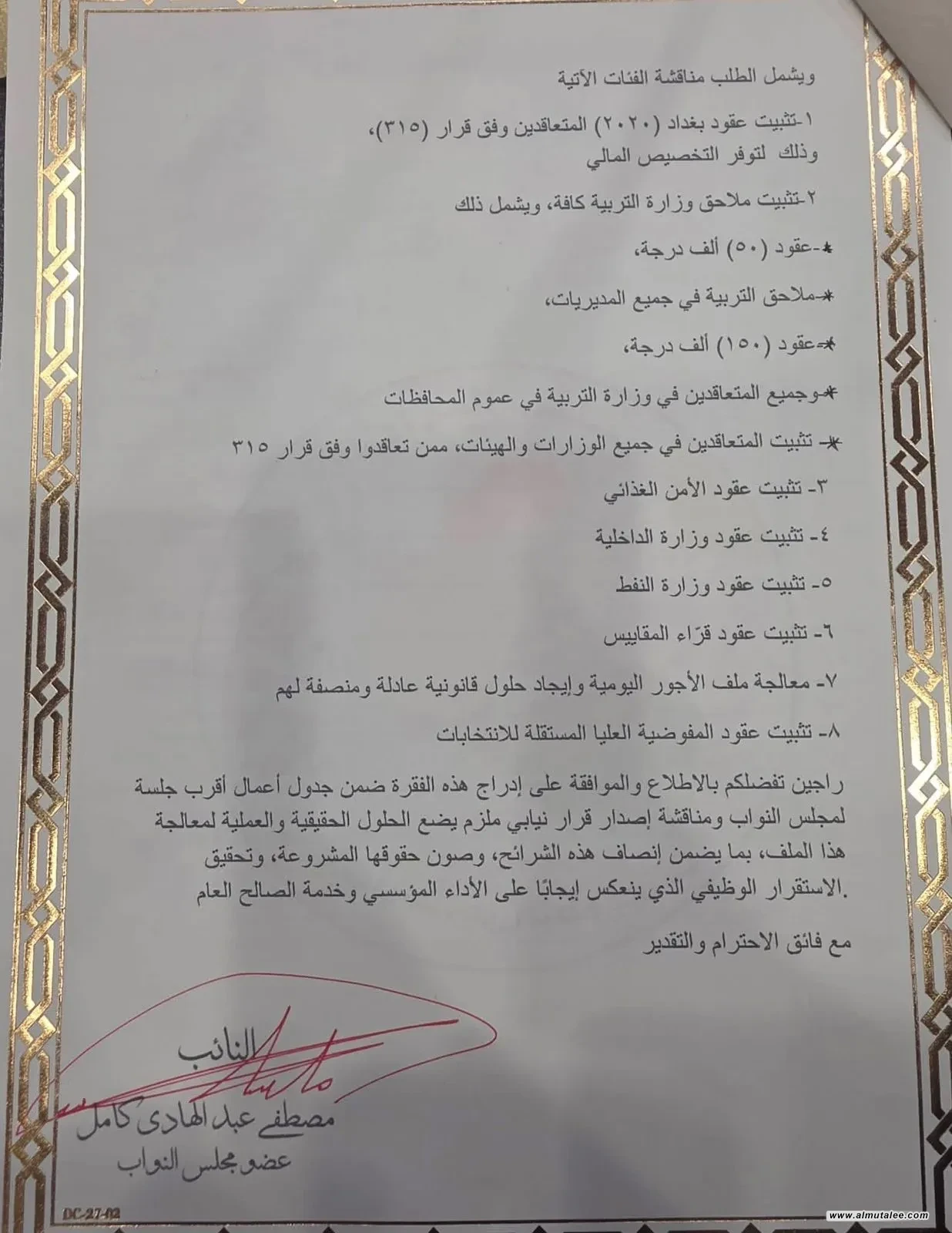 جمع تواقيع نيابية لإدراج فقرة على جدول أعمال مجلس النواب لتثبيت العقود