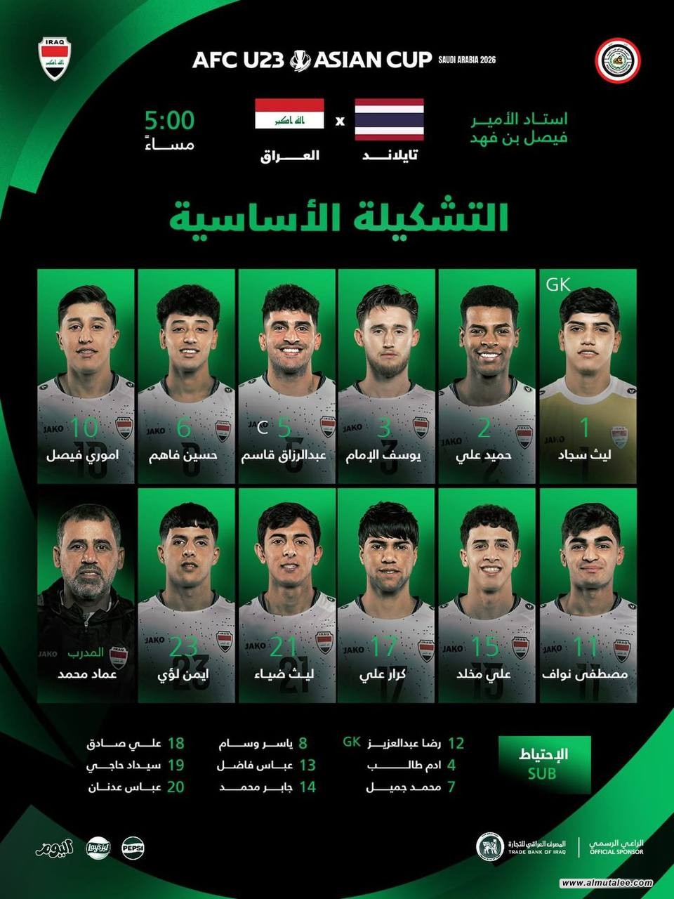 أعلن الكادر الفني لمنتخبنا الأولمبي، اليوم اﻷحد، عن تشكيلة منتخبنا لمواجهةِ نظيره التايلاندي ضمن الجولة الثانية من نهائيات كأس آسيا تحت 23 عاماً.