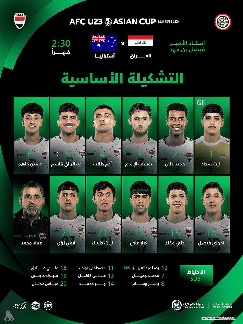 "المطلع" تنشر تشكيلة منتخبنا الأولمبي لمواجهة أستراليا