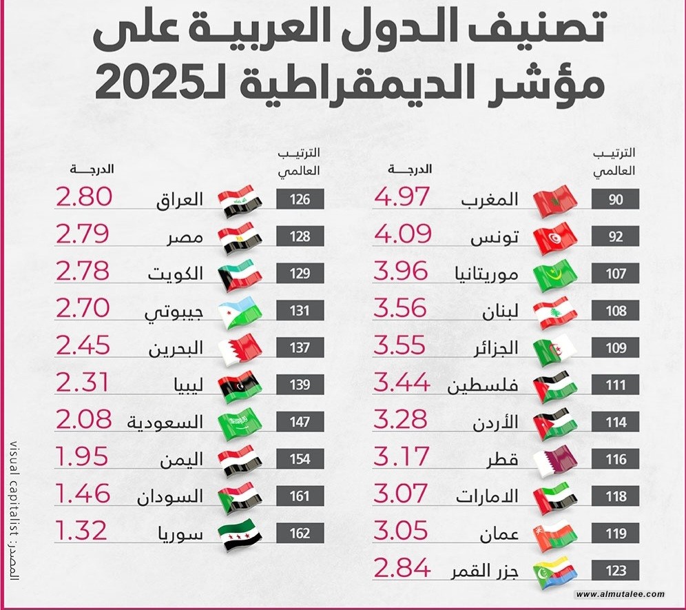 وفيما يلي إنفوغراف بتصنيف الدول العربية على مؤشر الديمقراطية للعام 2025: