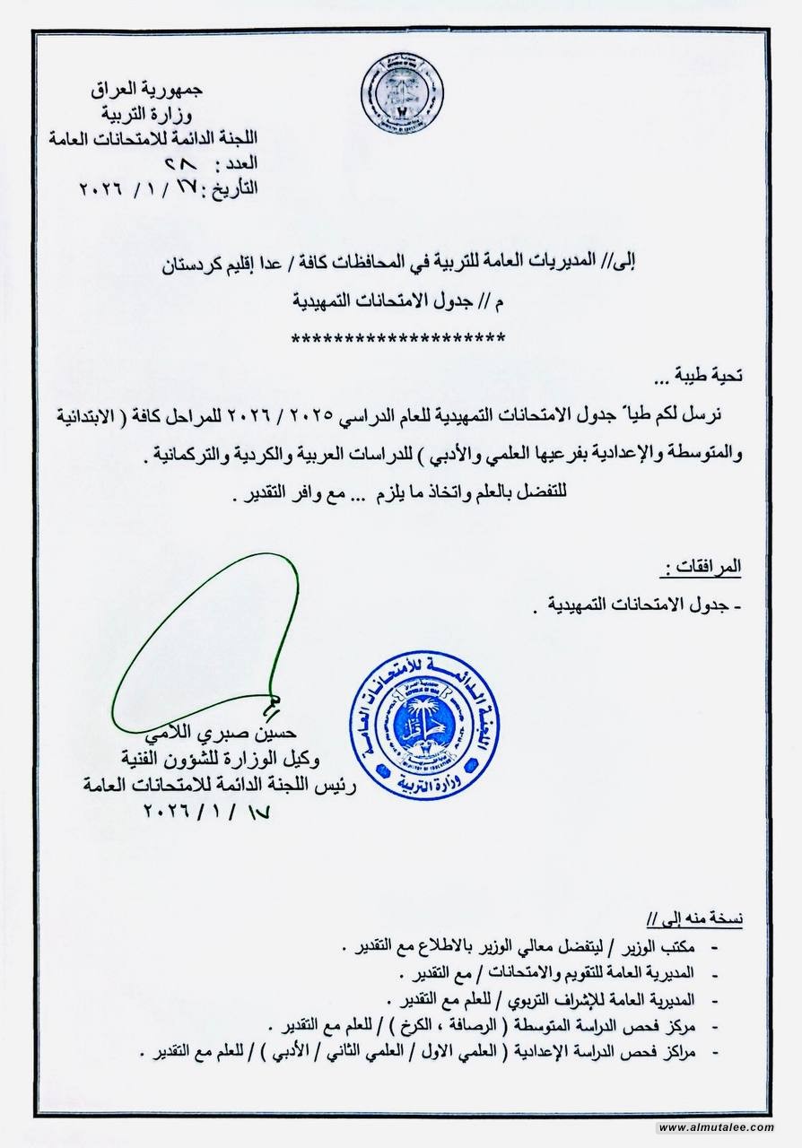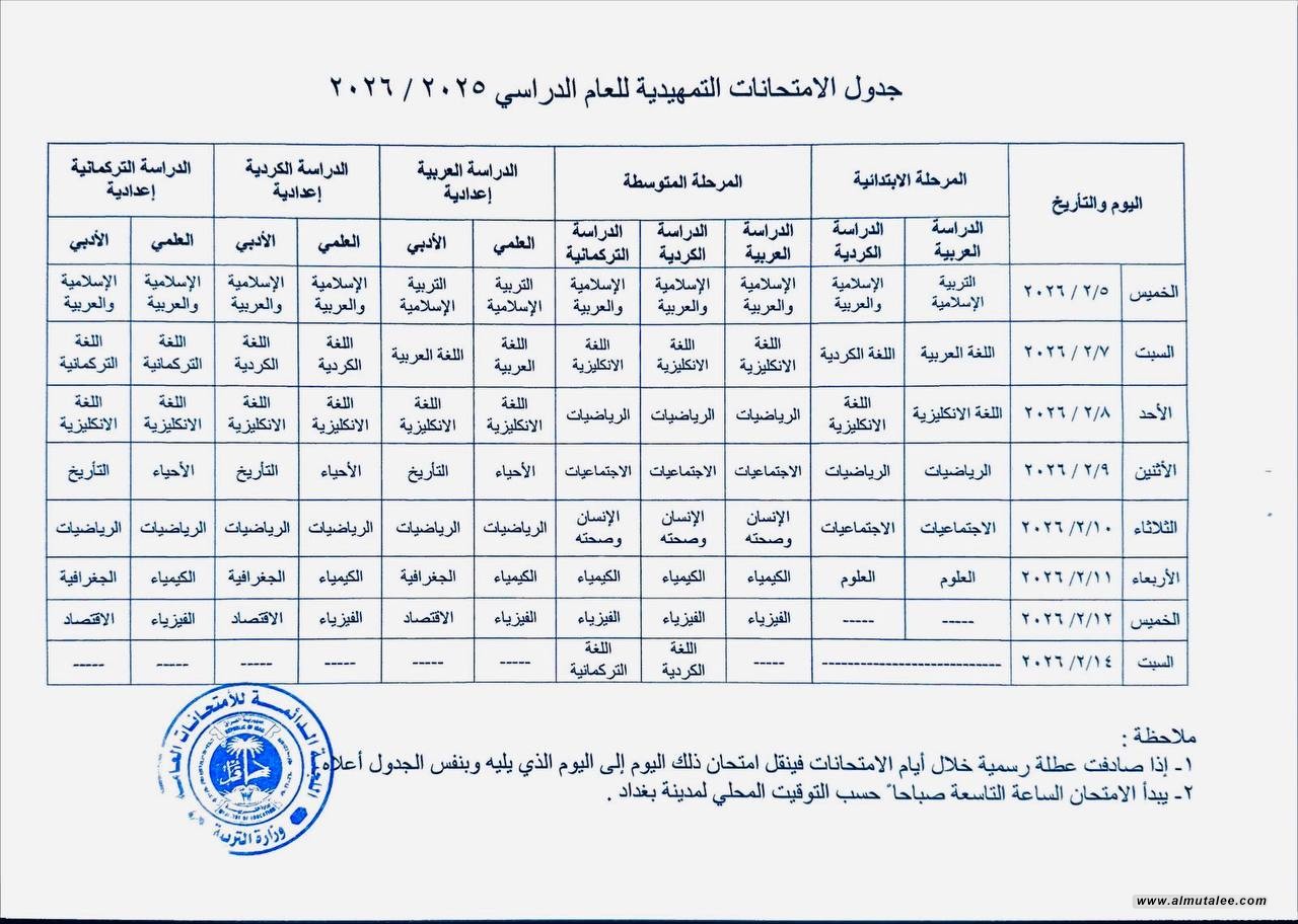 اعلنت وزارة التربية ،اليوم السبت، عن جدول الامتحانات التمهيدية للعام الدراسي 2025 / 2026 للمراحل الدراسية ( الابتدائي والمتوسط والاعدادي ).