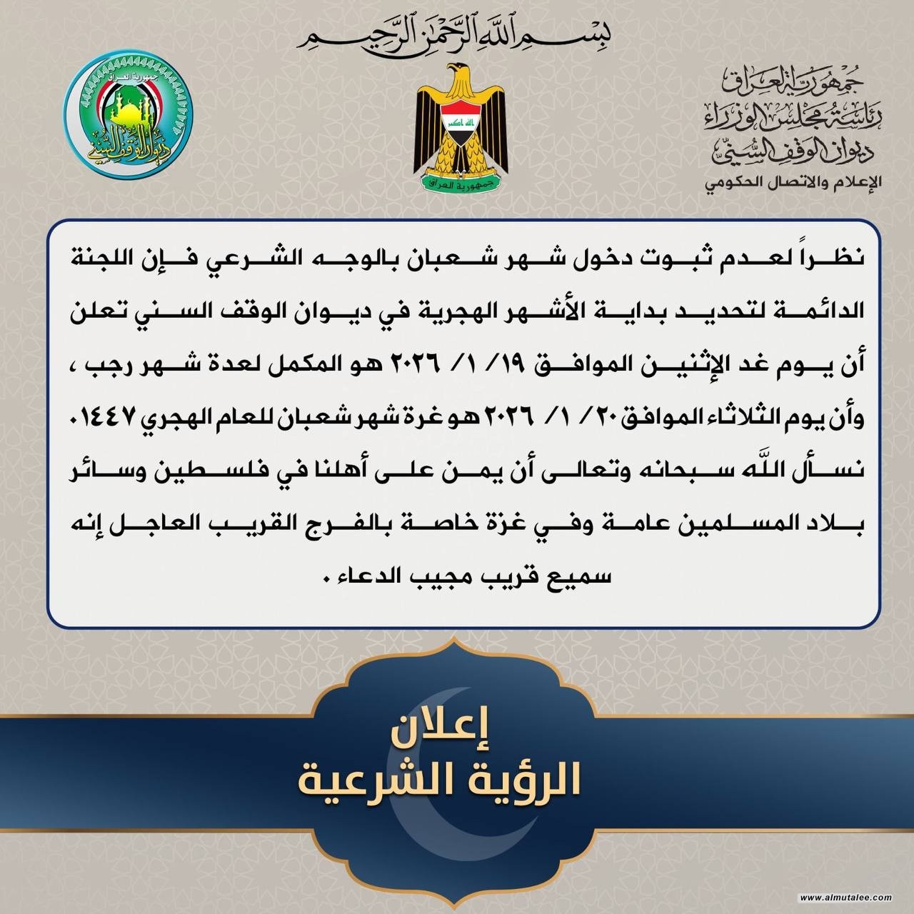 وذكر بيان للديوان تابعته "المطلع"، انه "نظراً لعدم ثبوت دخول شهر شعبان بالوجه الشرعي فإن اللجنة الدائمة لتحديد بداية الأشهر الهجرية في ديوان الوقف السني تعلن أن يوم غد الإثنين الموافق ١/١٩/ ٢٠٢٦ هو المكمل لعدة شهر رجب، وأن يوم الثلاثاء الموافق ٢٠ / ١ / ٢٠٢٦ هو غرة شهر شعبان للعام الهجري ١٤٤٧هـ".