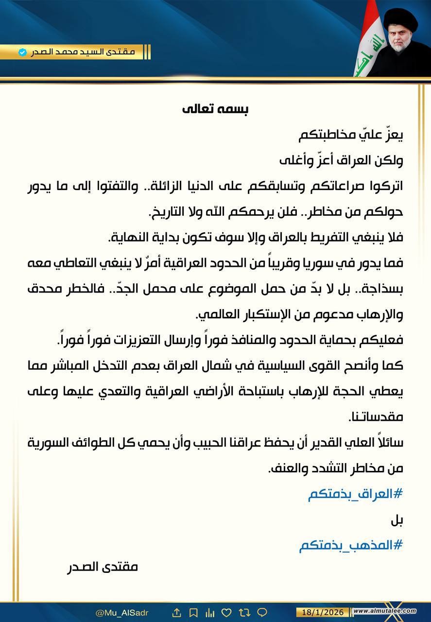 الصدر يحذر من خطر محدق: عليكم بحماية الحدود مع سوريا فوراً