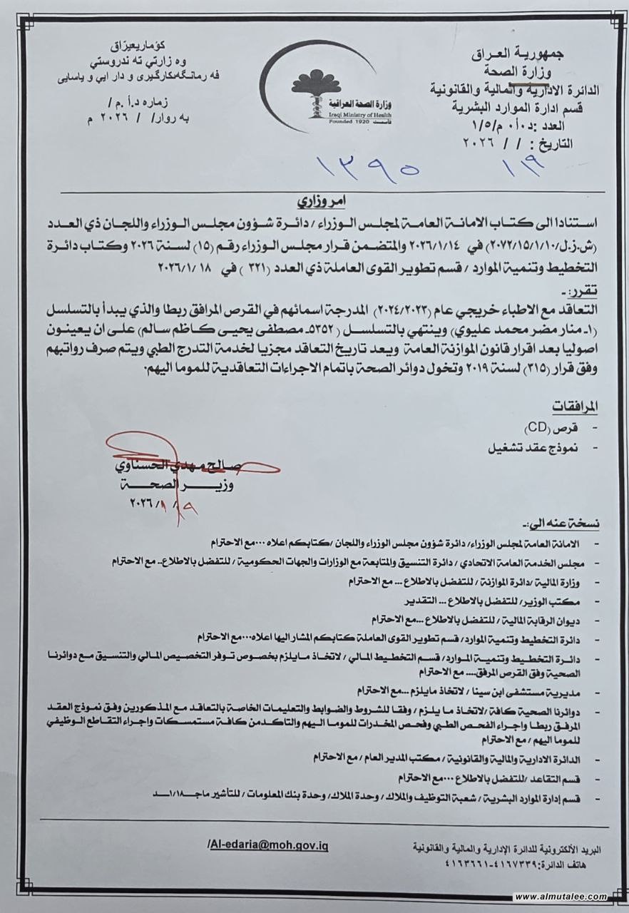 وأضافت:"يعد تاريخ التعاقد مجزياً لخدمة التدرج الطبي ويتم صرف رواتبهم وفق قرار (315) لسنة 2019 وتخول دوائر الصحة بإتمام الإجراءات التعاقدية للموما إليهم".