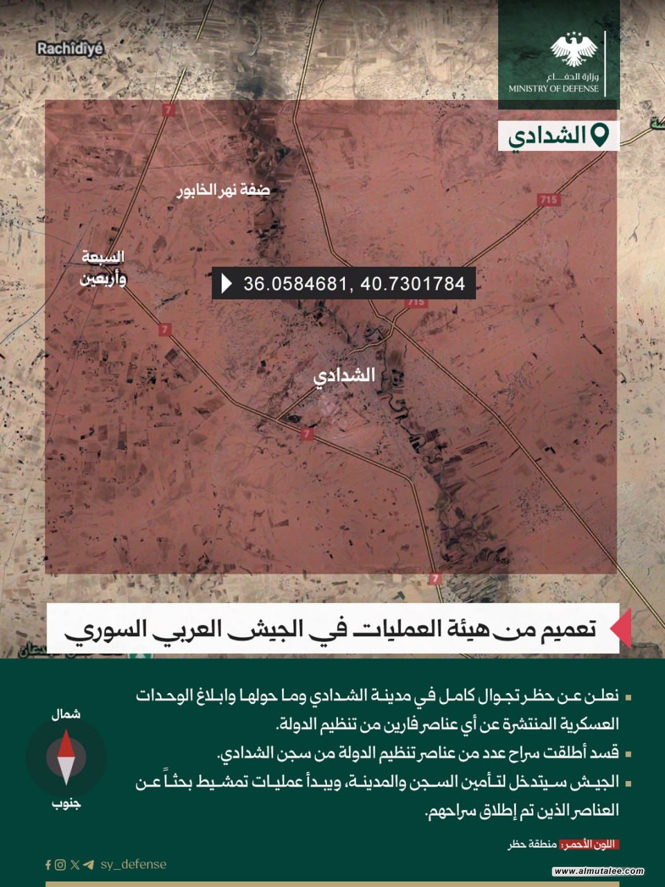 ونقلت وكالة الأنباء الرسمية "سانا" عن هيئة العمليات في الجيش العربي السوري قولها: "نعلن عن حظر تجوال كامل في مدينة الشدادي وما حولها، وإبلاغ الوحدات العسكرية المنتشرة عن أي عناصر فارين من تنظيم داعش الارهابي".