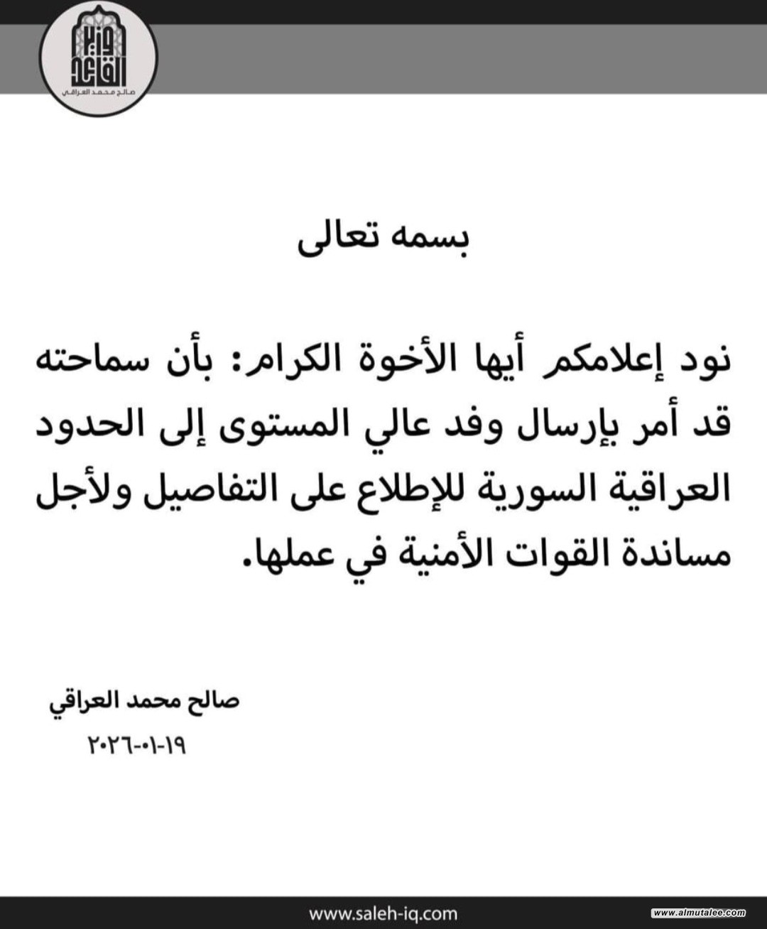 وقال العراقي، "نود إعلامكم أيها الأخوة الكرام: بأن سماحته قد أمر بإرسال وفد عالي المستوى إلى الحدود العراقية السورية للإطلاع على التفاصيل ولأجل مساندة القوات الأمنية في عملها".