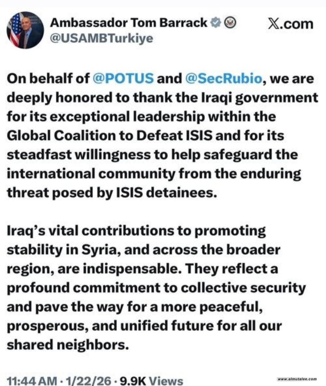 وقال برّاك في تدوينة على منصّة "إكس" تابعته "المطلع، "باسم الرئيس الأميركي دونالد ترامب ووزير الخارجي مارك روبيو، يشرفنا بشدة أن نشكر الحكومة العراقية على قيادتها الاستثنائية داخل التحالف العالمي لهزيمة داعش، وعلى استعدادها الثابت للمساعدة في حماية المجتمع الدولي من التهديد الدائم الذي يشكله معتقلي داعش".