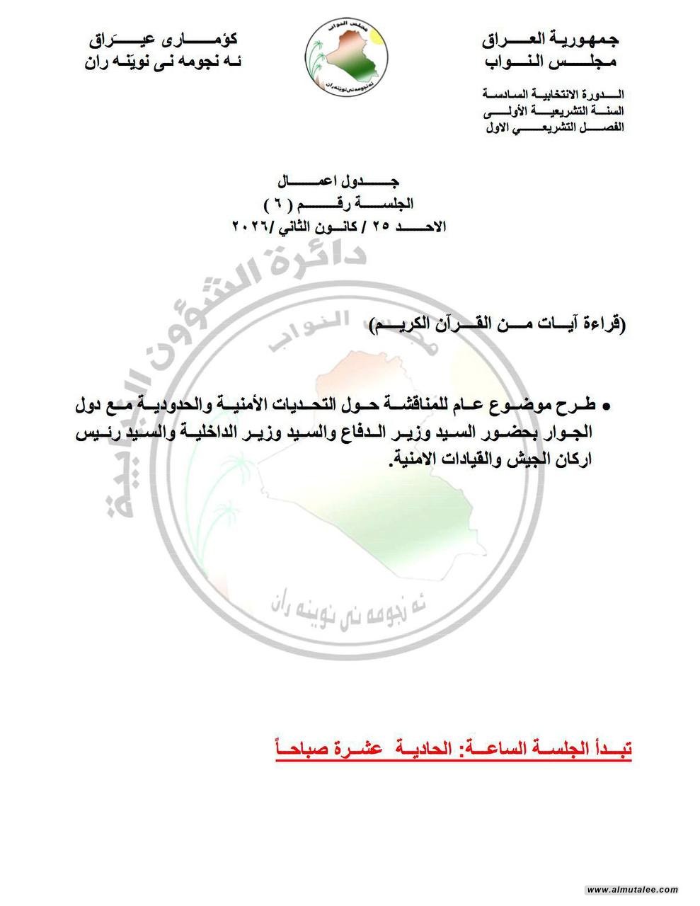 ونشر المكتب الإعلامي لمجلس النواب جدول أعمال جلسة البرلمان وتلقته المطلع، وتضمن طرح موضوع عام لمناقشة التحديات الأمنية والحدودية مع دول الجوار وبحضور وزيري الدفاع والداخلية ورئيس أركان الجيش والقيادات الأمنية.