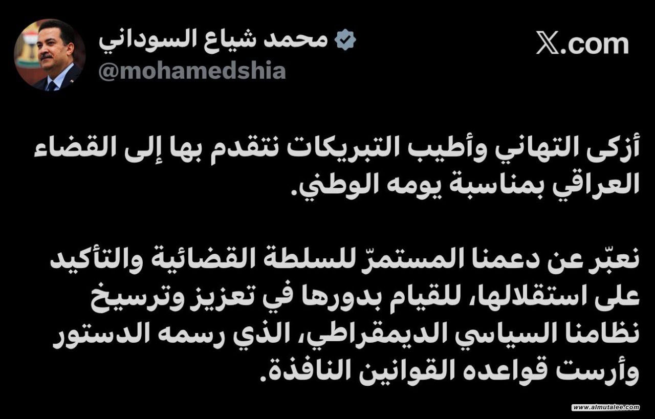 وقال السوداني في تدوينة له على منصة (إكس)، تابعتها وكالة المطلع، إنه:"أزكى التهاني وأطيب التبريكات نتقدم بها إلى القضاء العراقي بمناسبة يومه الوطني".
