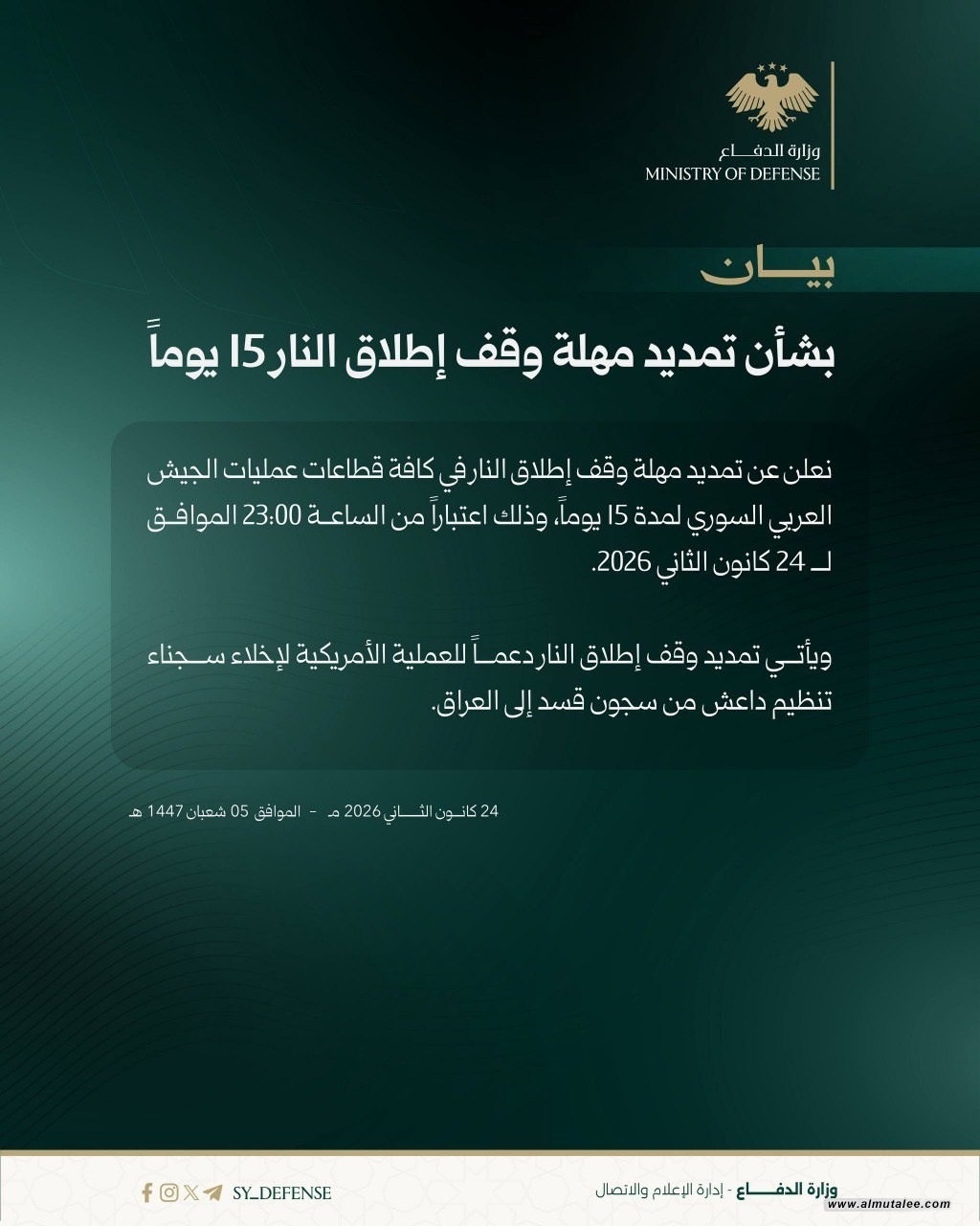 أعلنت وزارة الدفاع السورية، اليوم السبت، تمديد مهلة وقف إطلاق النار مع "قسد" 15 يوماً.