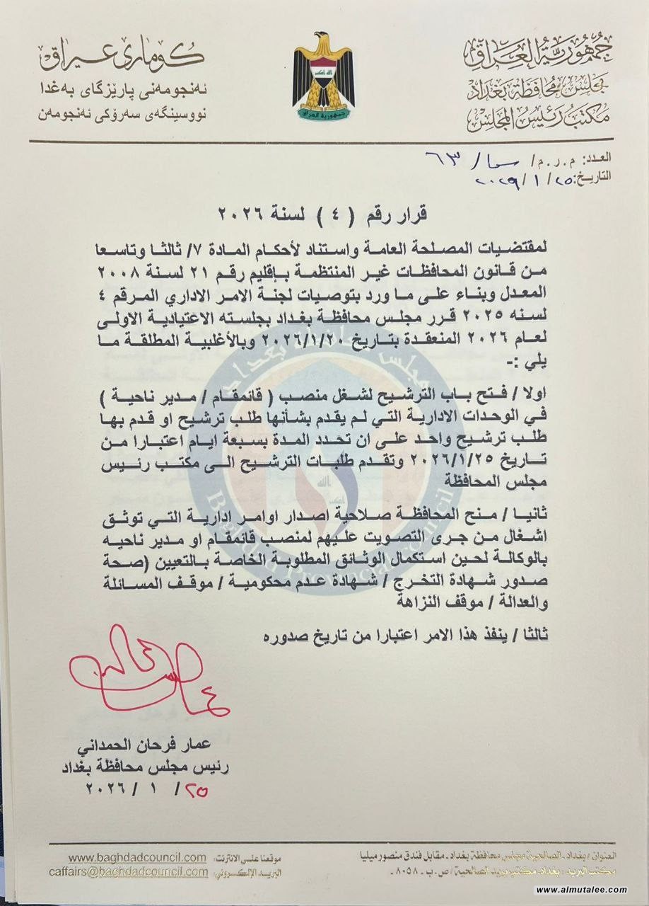 وقال رئيس مجلس محافظة بغداد عمار فرحان الحمداني في بيان تلقته المطلع، أنه:"لمقتضيات المصلحة العامة واستناد لأحكام المادة 7/ ثالثا وتاسعا من قانون المحافظات غير المنتظمة بإقليم رقم ٢١ لسنة ٢٠٠٨ المعدل وبناء على ما ورد بتوصيات لجنة الامر الاداري المرقم : لسنه ۲۰۲٥ قرر مجلس محافظة بغداد بجلسته الاعتيادية الأولى لعام ٢٠٢٦ المنعقدة بتاريخ ۲۰۲۹/۱/۲۰ وبالأغلبية المطلقة ما يلي :