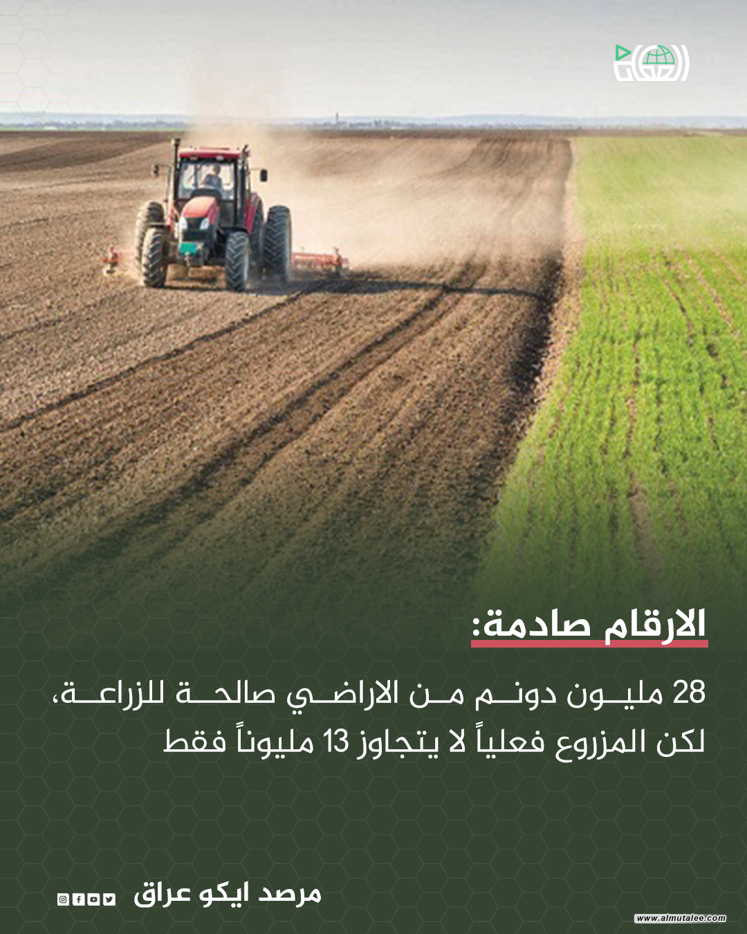 وأفاد مرصد "إيكو عراق" في تقرير تابعته “المطلع"، إن أكثر من نصف الأراضي الزراعية في العراق بات خارج الاستغلال، موضحاً أن إجمالي الأراضي الصالحة للزراعة في البلاد يبلغ نحو 28 مليون دونم، إلا أن المساحات الداخلة فعلياً في الإنتاج الزراعي لا تتجاوز 13 مليون دونم.