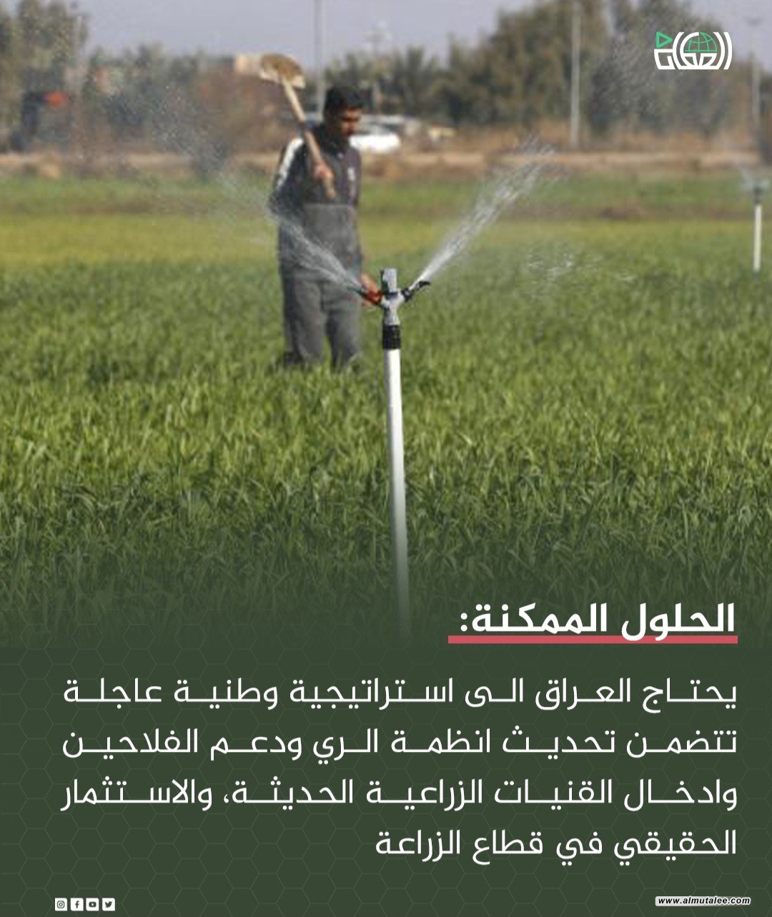 وطالب الموسوي الحكومة والجهات المعنية بـ"تبني خطة وطنية شاملة لإعادة إحياء الأراضي الزراعية، تشمل تحديث البنى التحتية للري، وتقديم حوافز حقيقية للفلاحين، وحماية الأراضي من التجاوزات العمرانية، إضافة إلى إشراك القطاع الخاص والتكنولوجيا الحديثة في تطوير الإنتاج".