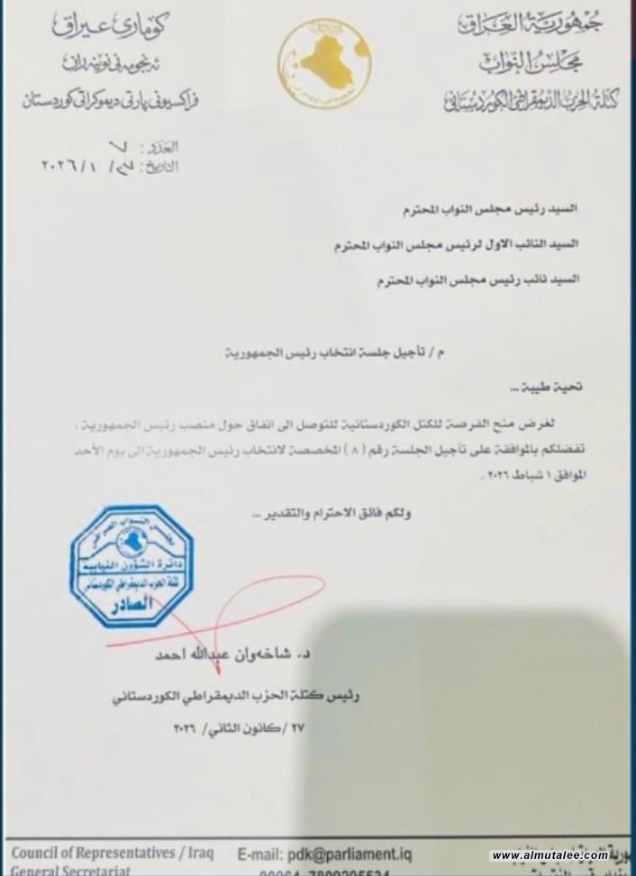 بالوثيقة... طلب الديمقراطي الكردستاني بتأجيل جلسة انتخاب رئيس الجمهورية ليوم الأحد