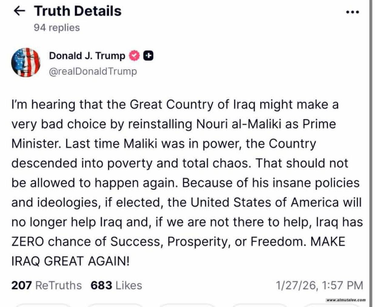 ترامب: العراق سيقدم على خيار سيئ للغاية بإعادة تنصيب نوري المالكي رئيساً للوزراء