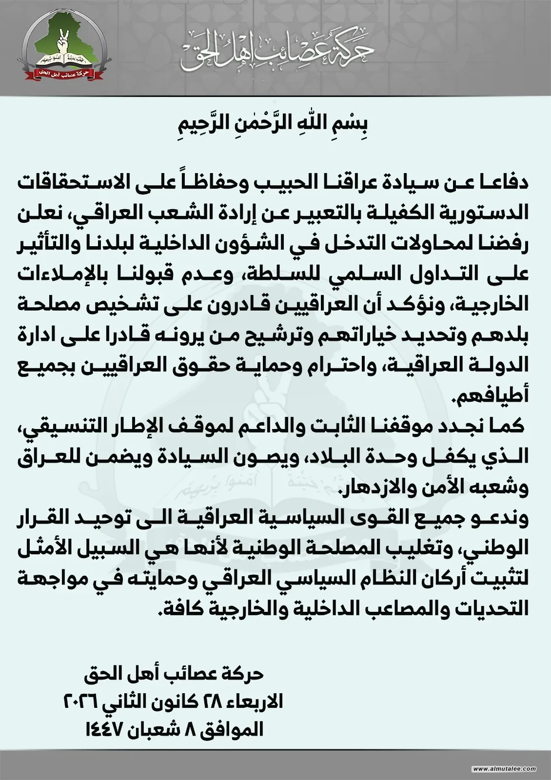 وأضافت الحركة:"نجدد موقفنا الثابت والداعم لموقف الإطار التنسيقي الذي يكفل وحدة البلاد ويصون سيادتها"، داعيةً "كافة القوى السياسية العراقية إلى توحيد القرار الوطني وتغليب المصلحة الوطنية، التي تمثل السبيل الأمثل لتثبيت أركان النظام السياسي العراقي وحمايته في مواجهة كافة التحديات والمصاعب الداخلية والخارجية".