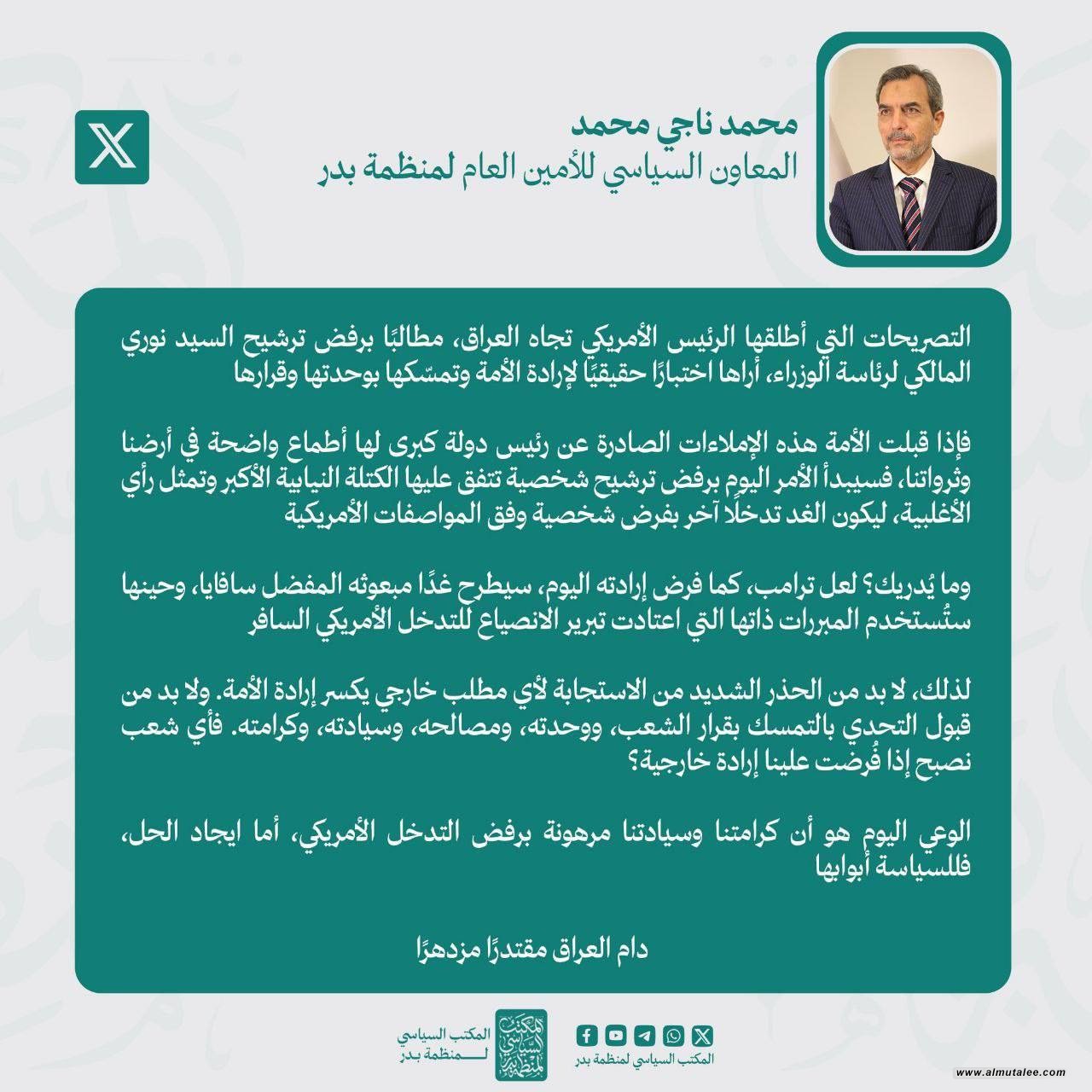 بدر: مطالب ترامب برفض ترشيح المالكي اختبار لإرادة الأمة ووحدتها