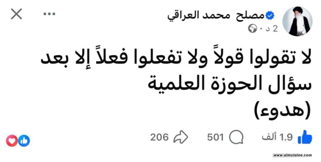 وجه صالح محمد العراقي، المعروف بـ”وزير القائد”، أنصار التيار الصدري بأن يلتزموا الهدوء وأن “لا تقولوا قولاً ولا تفعلوا فعلاً إلا بعد سؤال الحوزة العلمية”.