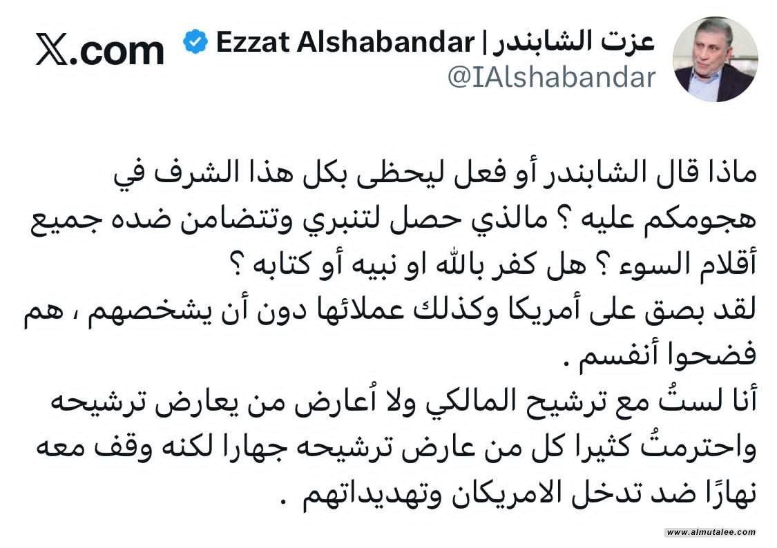 وقال الشابندر في تغريدة تابعتها "المطلع"، إنه:"ماذا فعلت لتنبري ضدي أقلام السوء .. لقد بصقت على عملاء أمريكا الذين فضحوا أنفسهم دون أن أشخصهم".
