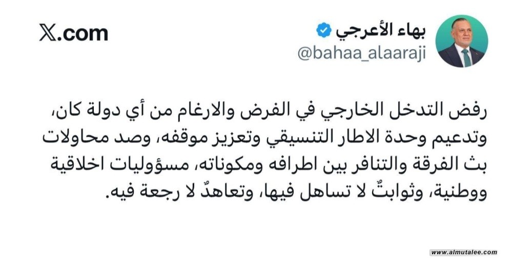 وقال الأعرجي في تدوينة تابعتها "المطلع"، إن:"رفض التدخل الخارجي في الفرض والارغام من أي دولة كان، وتدعيم وحدة الاطار التنسيقي وتعزيز موقفه، وصدّ محاولات بثّ الفرقة والتنافر بين أطرافه ومكوناته، مسؤوليات أخلاقية ووطنية، وثوابتٌ لا تساهل فيها، وتعاهدٌ لا رجعة فيه".