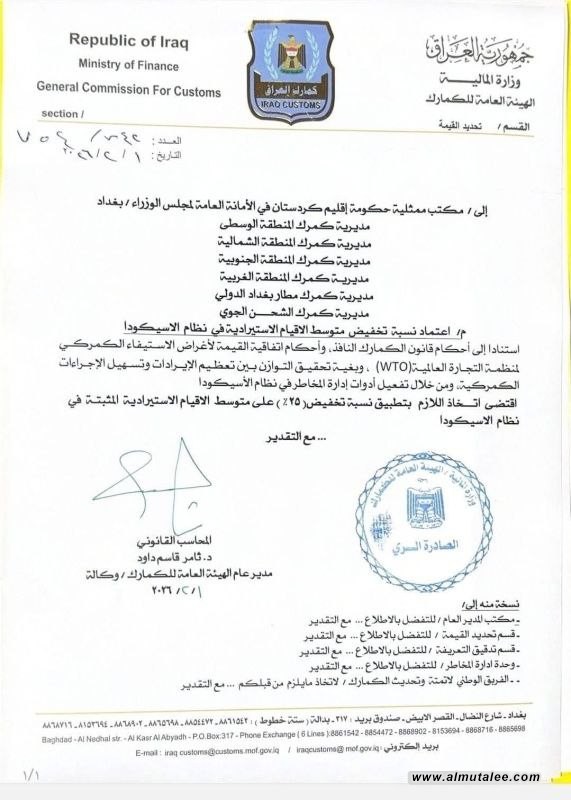 وأدناه كتاب الهيئة العامة للجمارك تلقته المطلع: