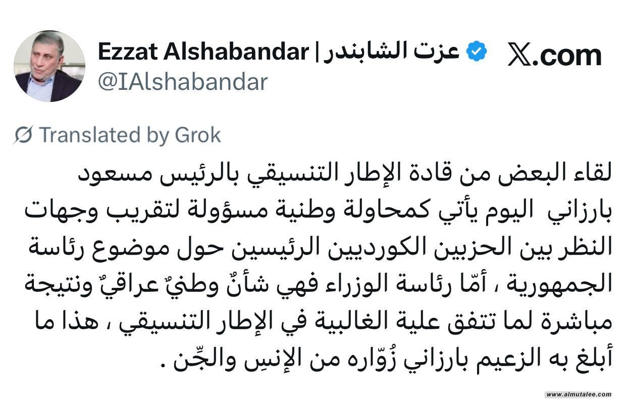 وقال الشابندر، في تدوينة، تابعتها المطلع، إن: “اللقاء الذي جمع عدداً من قادة الإطار التنسيقي مع رئيس الحزب الديمقراطي الكردستاني مسعود بارزاني، اليوم، يندرج في إطار محاولة وطنية مسؤولة تهدف إلى تقريب وجهات النظر بين الحزبين الكرديين الرئيسيين بشأن منصب رئاسة الجمهورية”.