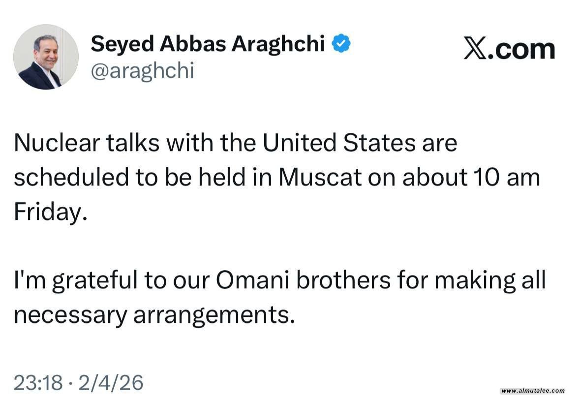 وقال عراقجي في تدوينة له على منصة (إكس)، تابعتها "المطلع"، أنه:"من المقرر عقد محادثات نووية مع الولايات المتحدة في مسقط حوالي الساعة العاشرة صباحاً ،يوم الجمعة"، معربا عن شكره للعمانيين على قيامهم بجميع الترتيبات اللازمة.