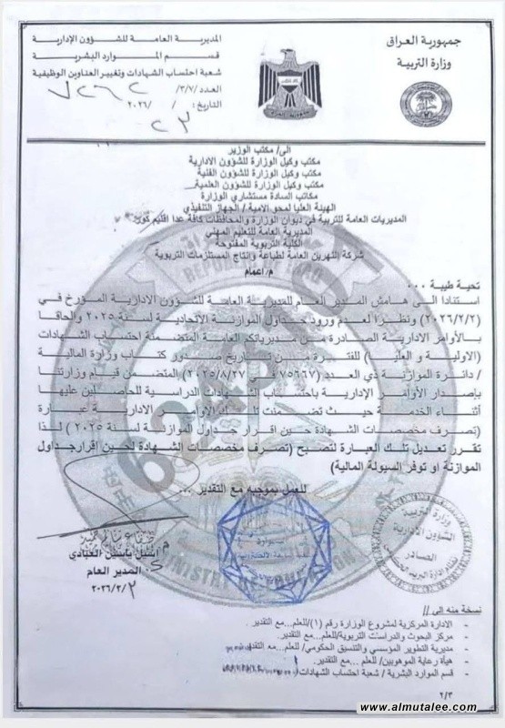 أظهرت وثيقة صادرة عن المديرية العامة للشؤون الإدارية في وزارة التربية، اليوم الجمعة، قراراً يقضي بتعديل فقرة احتساب مخصصات الشهادة، لتكون "لحين إقرار جداول الموازنة أو توفر السيولة المالية"، في إشارة إلى ربط صرف هذه المخصصات بالوضع المالي والتخصيصات المتاحة.