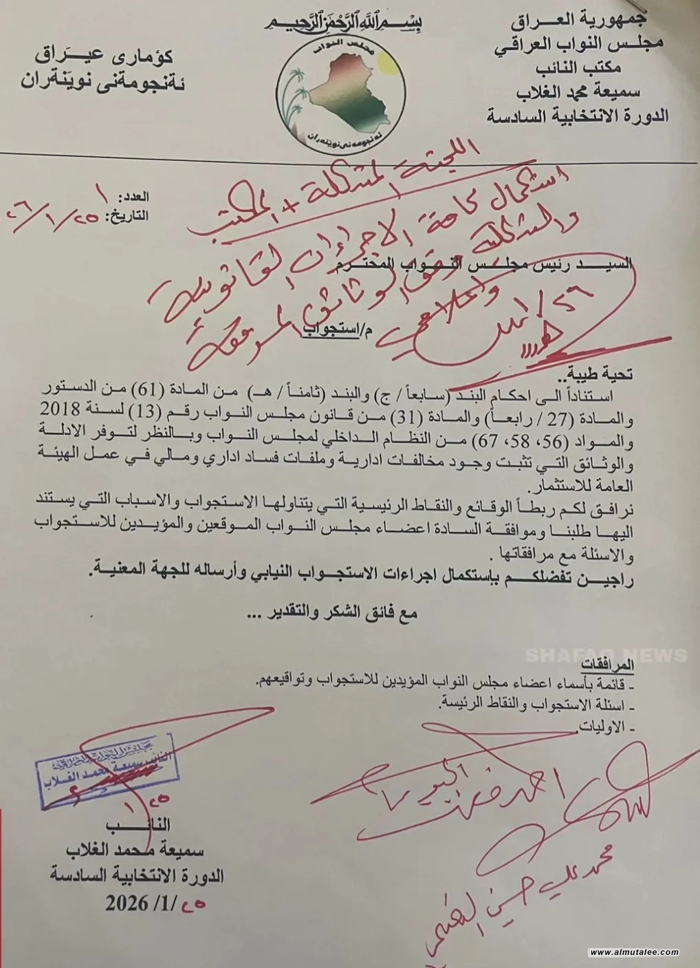 وتظهر الوثائق تواقيع لـ"63" نائباً لغرض الاستجواب، وموقعة كذلك من قبل رئيس مجلس النواب هيبت الحلبوسي، بالموافقة واتخاذ الإجراءات القانونية.