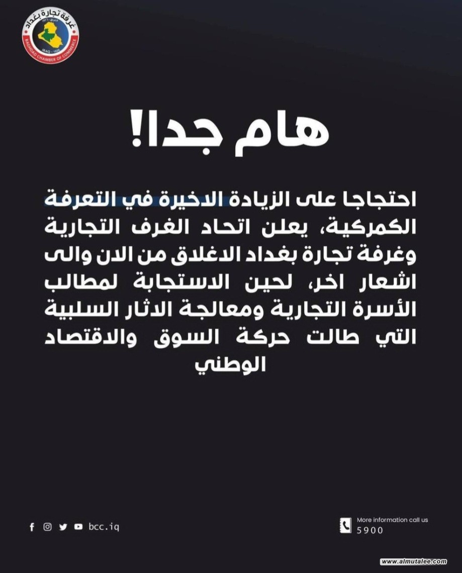 أعلن اتحاد الغرف التجارية وغرفة تجارة بغداد، اليوم الاثنين، عن الإغلاق العام اعتباراً من الآن وإلى إشعار آخر، احتجاجاً على الزيادة الأخيرة في التعرفة الكمركية التي أقرتها الحكومة، وأكد الاتحاد أن هذا القرار التصعيدي جاء للمطالبة بالاستجابة الفورية لمطالب الأسرة التجارية ومعالجة الآثار السلبية التي طالت حركة السوق والاقتصاد الوطني.