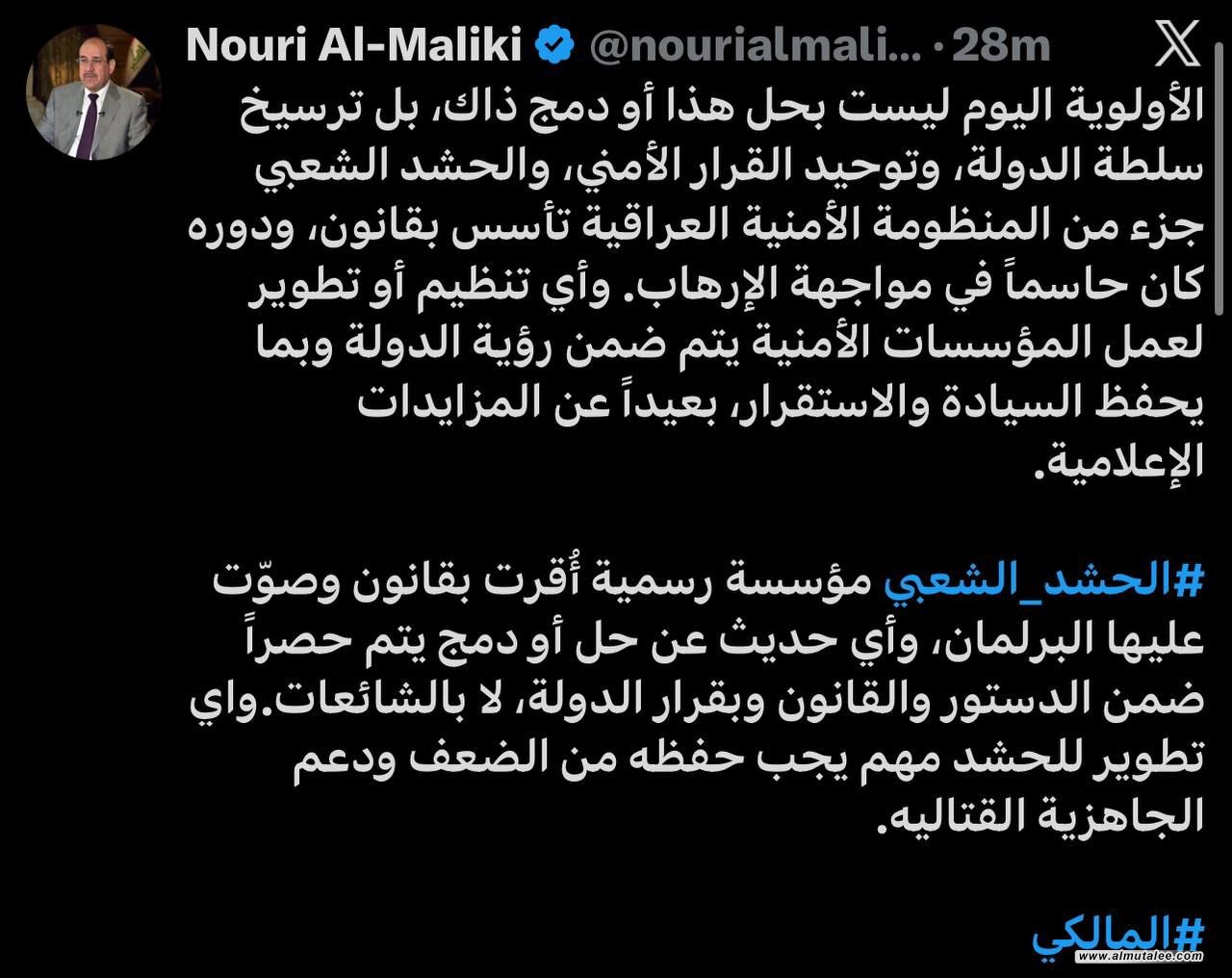 وأشار المالكي إلى أن، الحشد الشعبي مؤسسة رسمية أُقرت بقانون وصوّت عليها البرلمان، وأي حديث عن حل أو دمج يتم حصراً ضمن الدستور والقانون وبقرار الدولة، لا بالشائعات، مؤكداً أن:"أي تطوير للحشد يجب أن يحفظه من الضعف ويدعم جاهزيته القتالية".