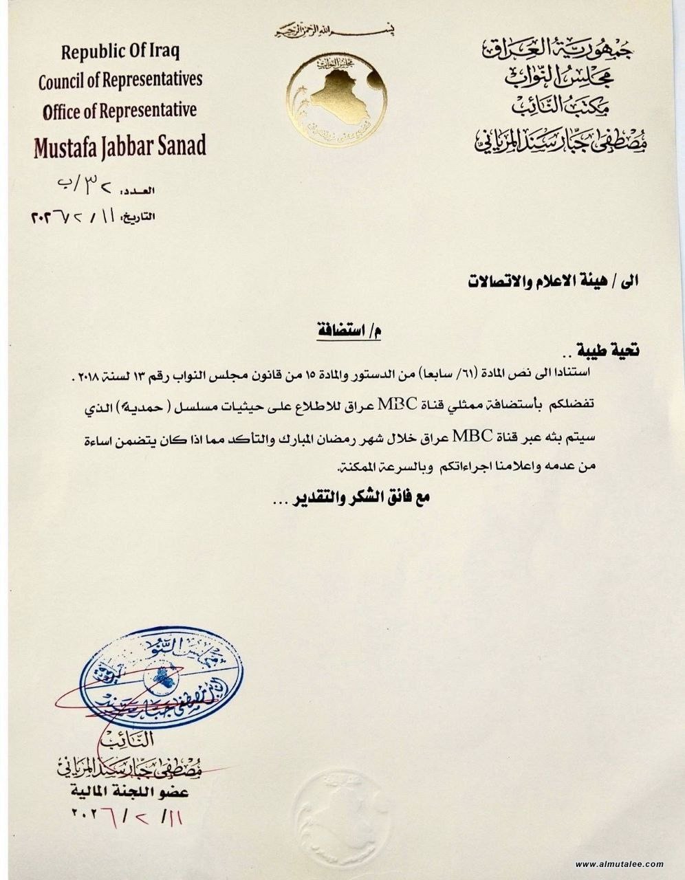 طلب النائب مصطفى جبار سند، اليوم الخميس، من هيئة الإعلام والاتصالات استضافة ممثلي قناة (MBC) عراق، بهدف الاطلاع على حيثيات مسلسل "حمدية".
